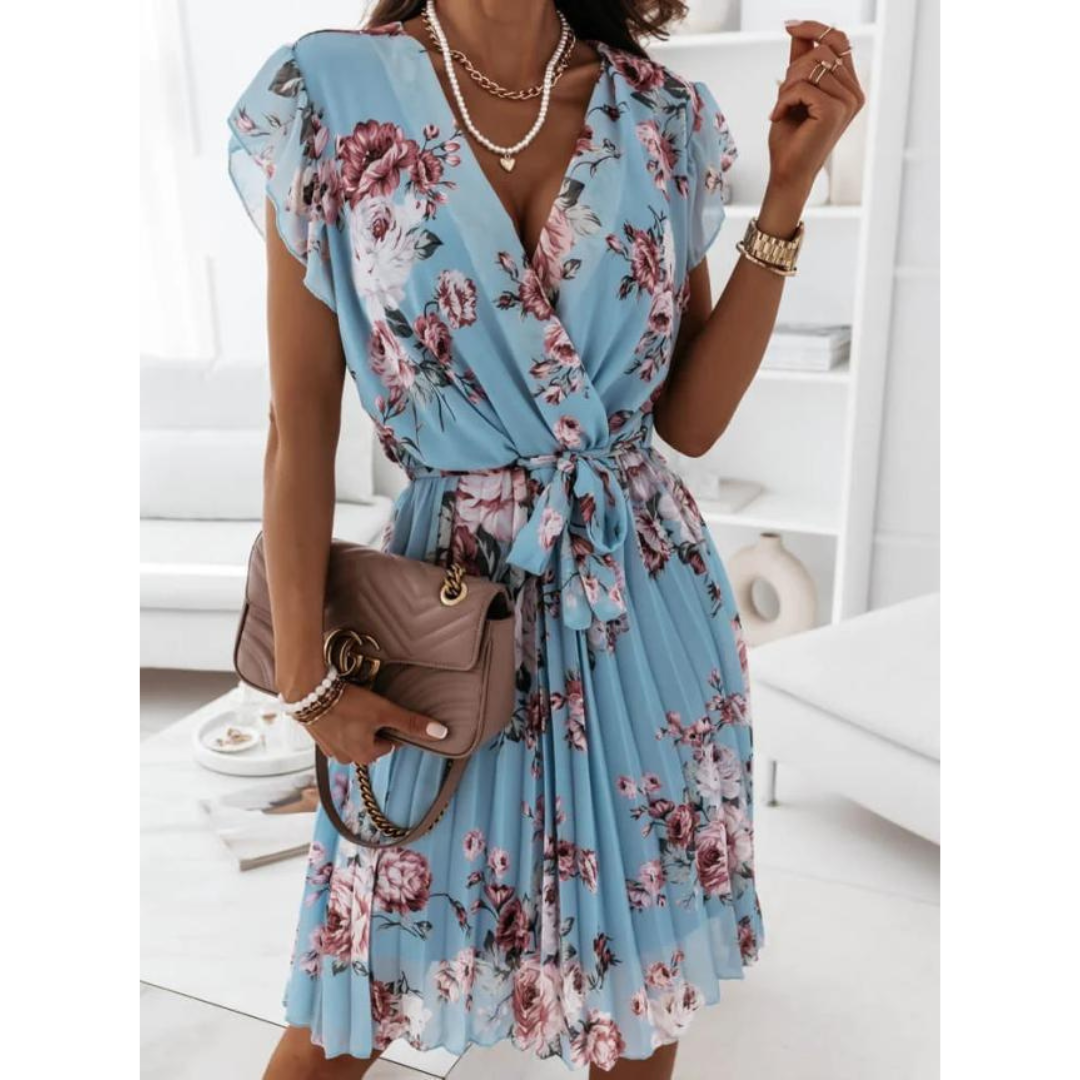 Dieses Kleid zeigt ein feminines Design mit einem Wickelausschnitt und einem Band in der Taille. Es hat eine lockere Passform mit kurzen, gerafften Ärmeln, die dem Design eine elegante Note verleihen. Das Kleid fällt in Midi-Länge und hat Falten, die eine fließende Erscheinung erzeugen.
