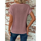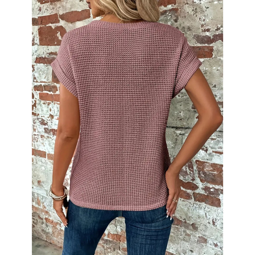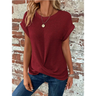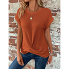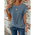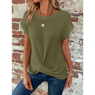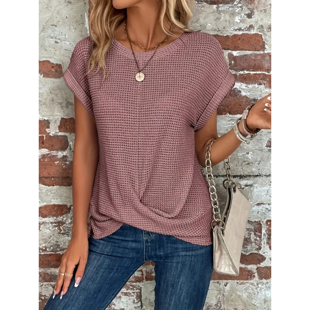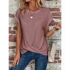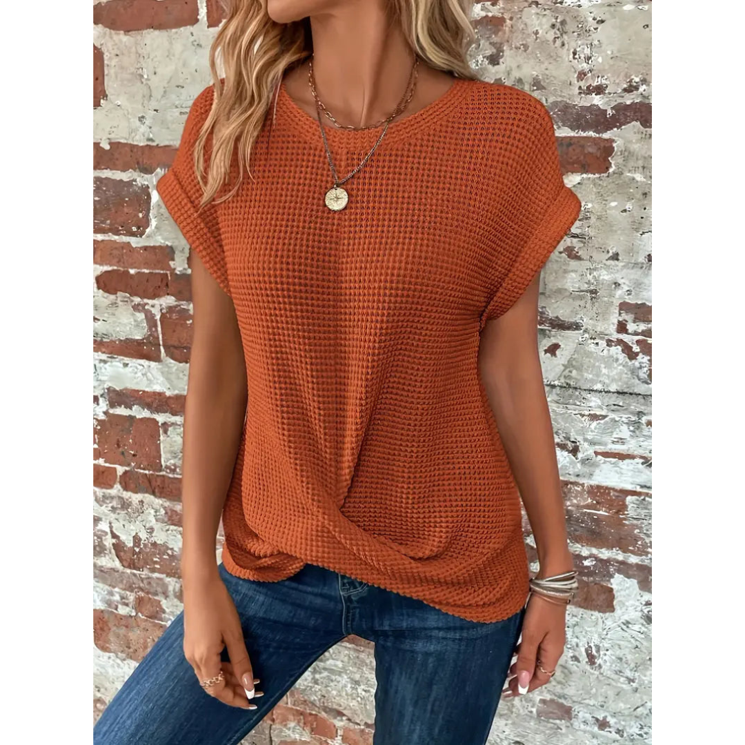 Dieses Oberteil hat kurze Ärmel, ein strukturiertes Muster und einen runden Ausschnitt. Die Vorderseite ist mit einer Twist-Detailgestaltung versehen, die das Design abrundet. Die Rückseite zeigt sich schlicht und klar, was das Gesamtbild harmonisch wirken lässt.