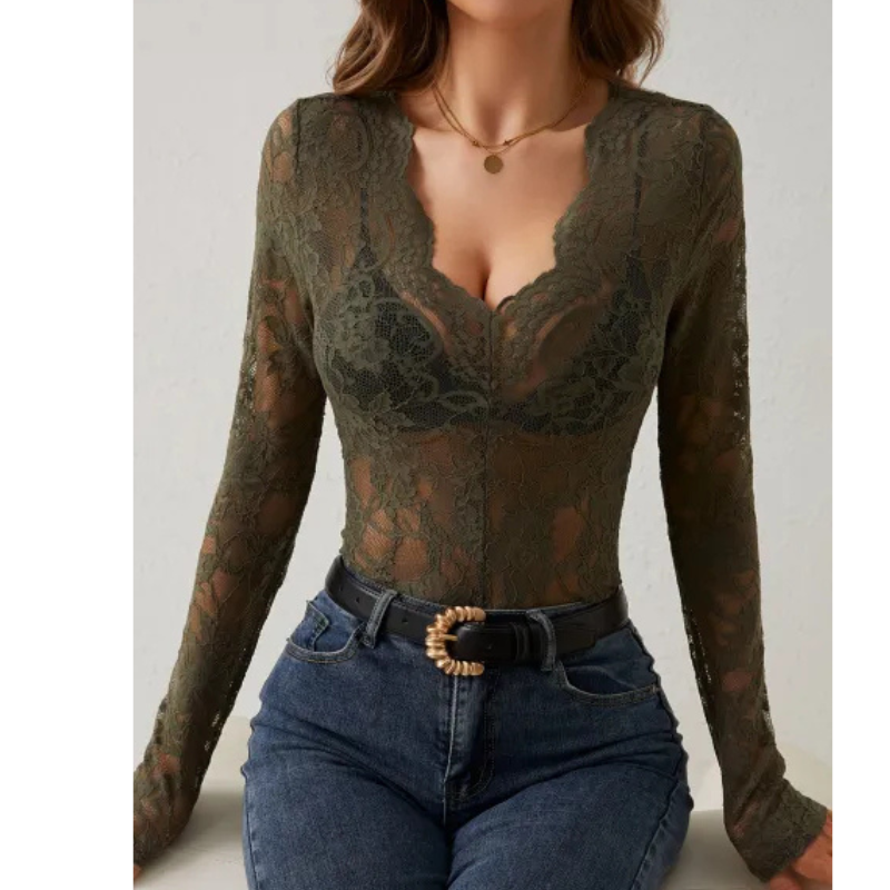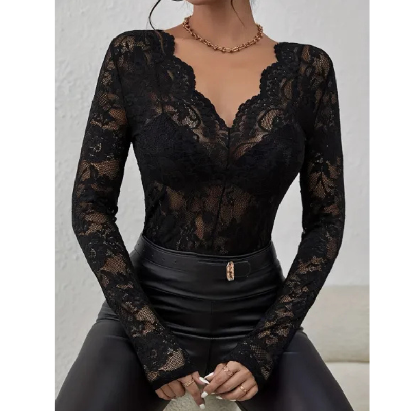 Dieses Top zeigt ein Spitzen-Design mit tiefem V-Ausschnitt und langen Ärmeln. Das filigrane Muster der Spitze setzt detaillierte Akzente im gesamten Design. Der figurbetonte Schnitt unterstreicht die klare Struktur, während der halbtransparente Stoff die visuellen Details betont.