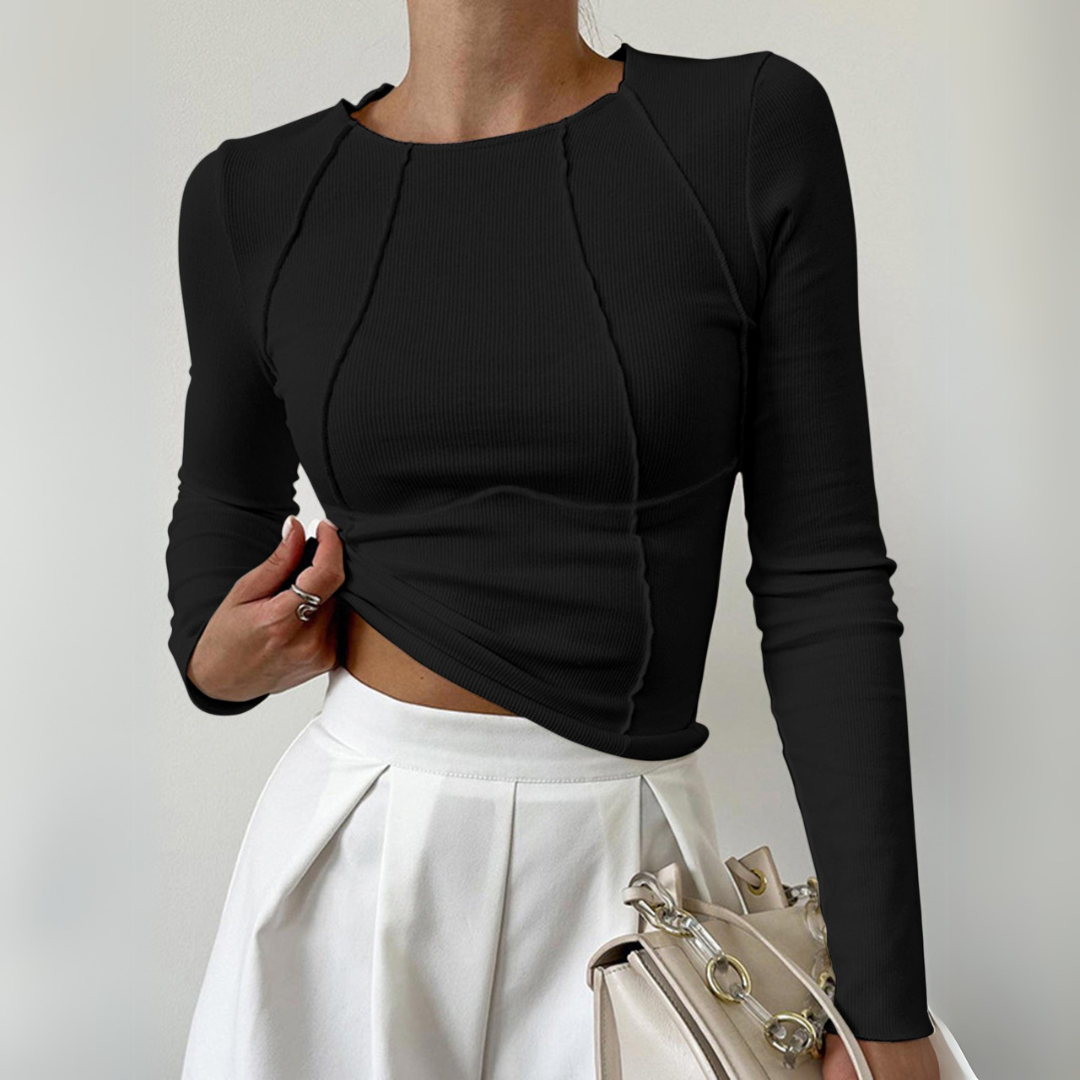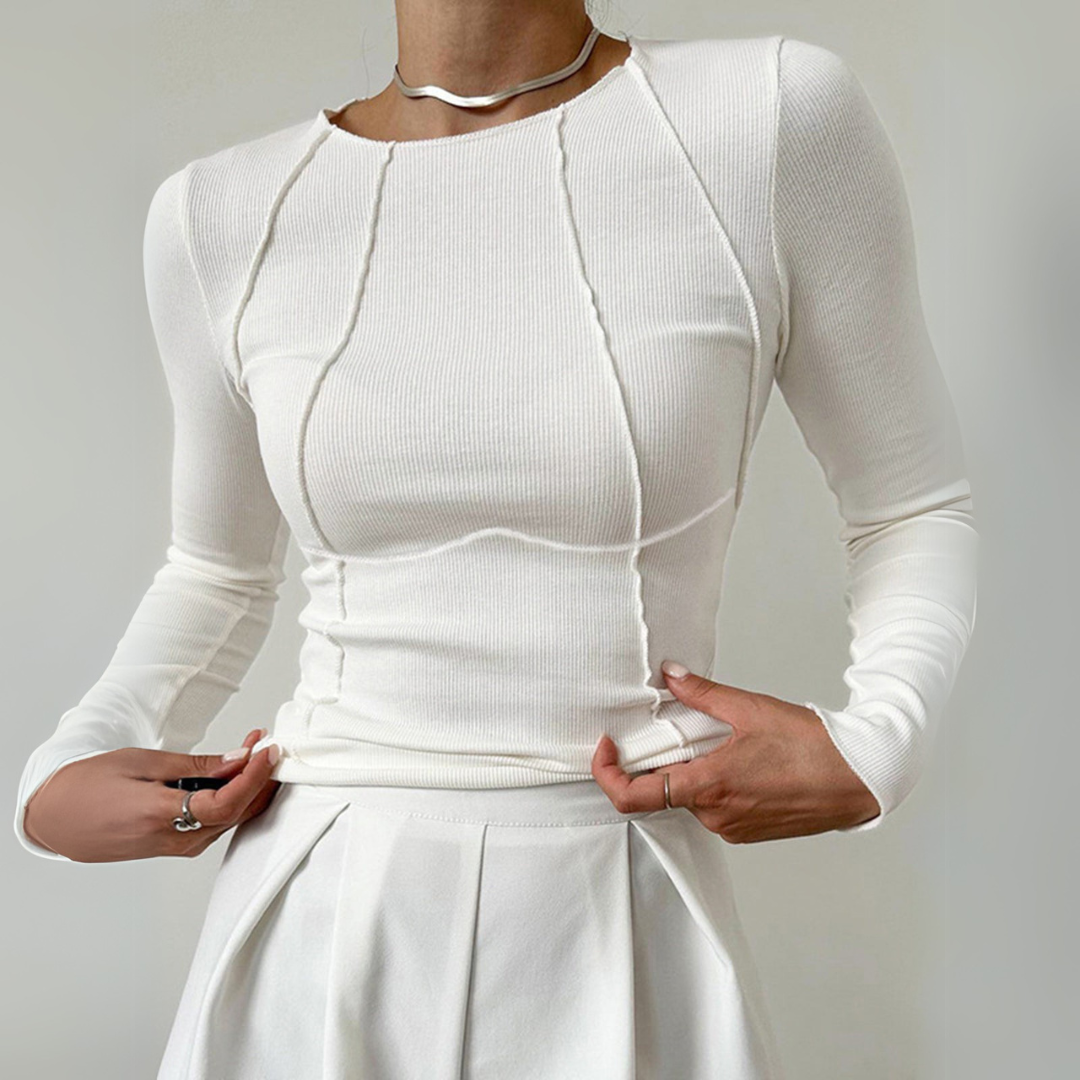 Dieses figurbetonte Langarm-Oberteil verfügt über einen runden Ausschnitt und sichtbare Nahtdetails, die dem Design Struktur verleihen. Die klare und einfache Silhouette macht es zu einem vielseitigen Kleidungsstück. Die langen Ärmel und die minimalistische Verarbeitung sorgen für ein strukturiertes und elegantes Aussehen.