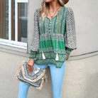 Diese Bluse hat ein fließendes Design mit Knopfdetails und einem V-Ausschnitt. Die langen Ärmel werden durch elastische Bündchen ergänzt, während die dekorativen Quasten dem Design eine verspielte Note verleihen. Das auffällige Muster sorgt für einen besonderen Blickfang.