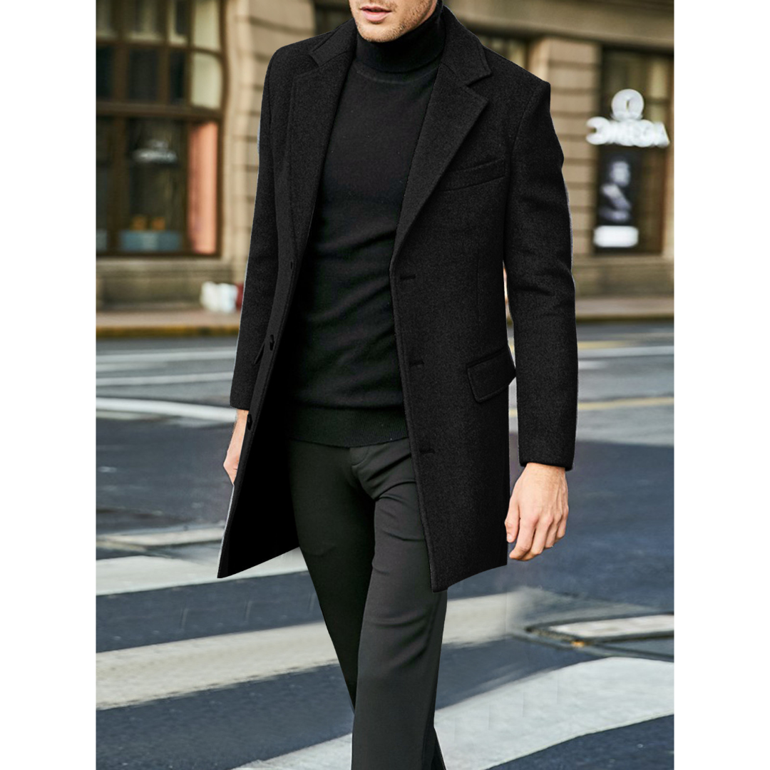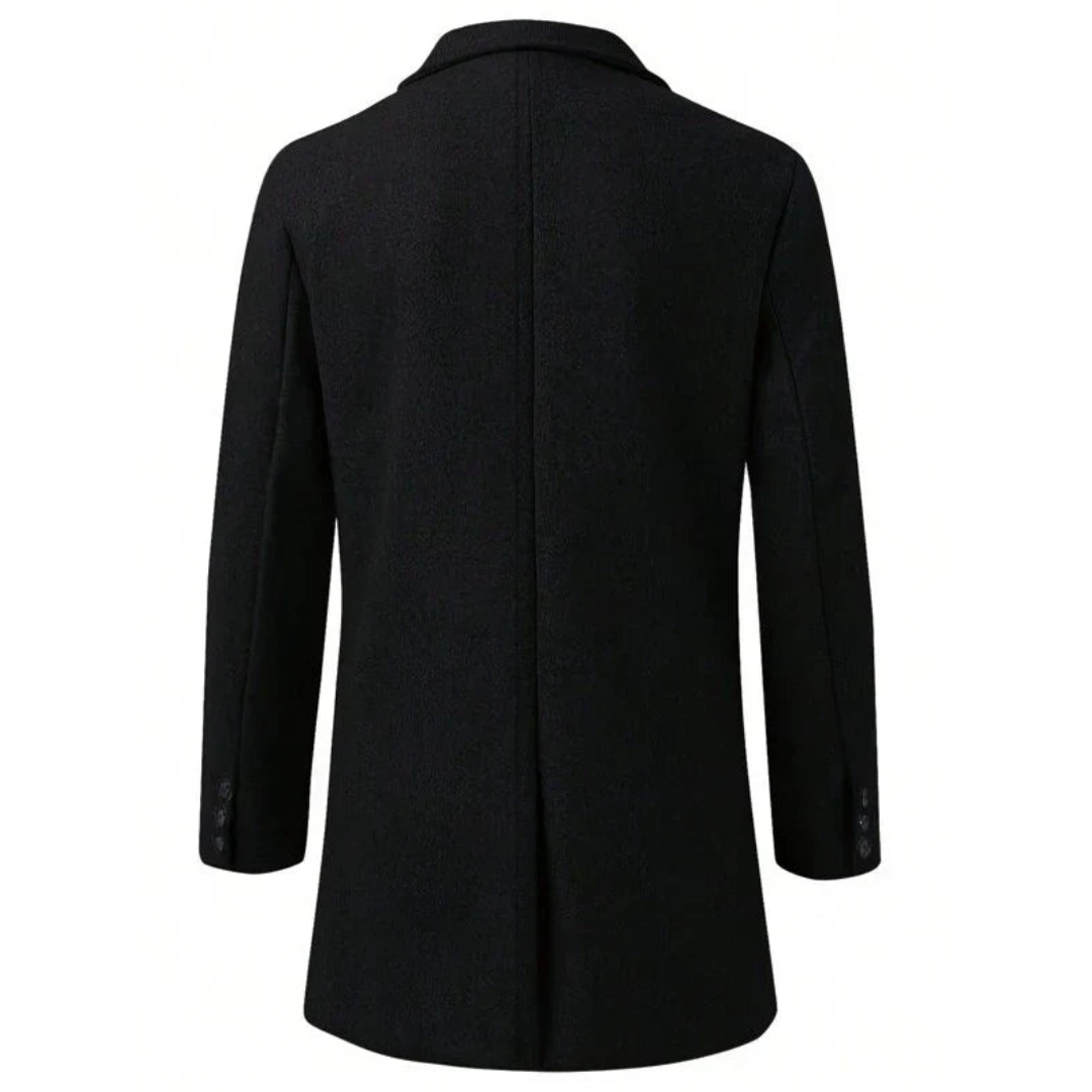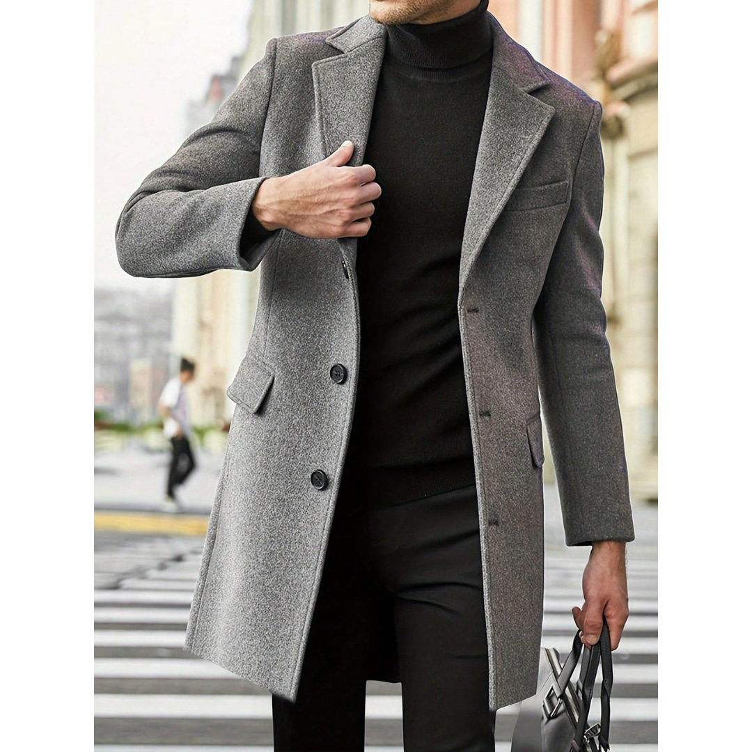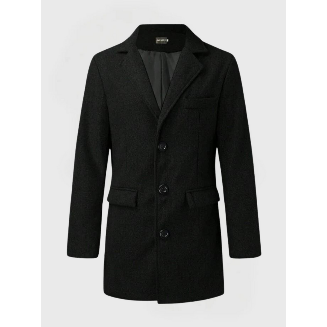 Dieser lange Mantel verfügt über ein klassisches Design mit Reverskragen und eine dreiknöpfige Vorderseite. Er hat seitliche Pattentaschen und eine Brusttasche. Der gerade Schnitt betont klare Linien und zeitlose Details.