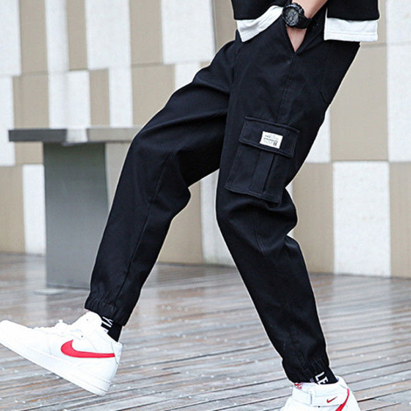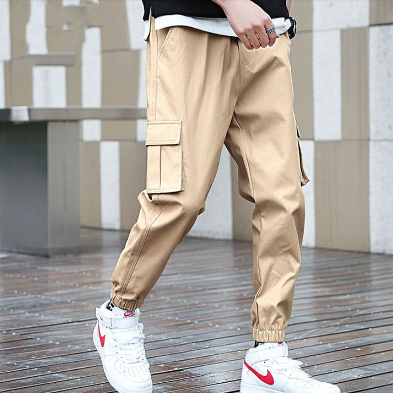 Diese Cargohose bietet eine lockere Passform mit mehreren Taschen, darunter seitliche Cargotaschen mit Klappen. Der elastische Bund ist mit einem verstellbaren Kordelzug versehen, und die elastischen Knöchelbündchen sorgen für einen sicheren Sitz. Sichtbare Nähte betonen das strukturierte Design.