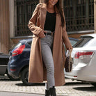 Dieser lange Mantel zeichnet sich durch ein Design mit Gürtel, einem strukturierten Kragen und einer taillierten Passform aus. Der Bindegürtel betont die Silhouette, während die Länge vollständige Abdeckung bietet. Das klare Design und die detaillierte Verarbeitung unterstreichen die elegante Ausführung.