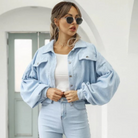 Eine kurze Jacke mit strukturierter Optik. Die Vorderseite hat Knopfverschlüsse und zwei Brusttaschen. Die langen Ärmel haben geraffte Bündchen, die eine voluminöse Form erzeugen. Der Kragen sorgt für eine definierte Kontur. Das Material erscheint strukturiert und verleiht der Jacke ein besonderes Aussehen.