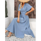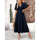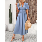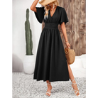 Dieses Kleid zeichnet sich durch einen V-Ausschnitt und kurze, schwingende Ärmel aus. Die Taille ist gerafft, was zu einem fließenden Effekt führt, der bis zum Boden reicht. Es ist so gestaltet, dass es eine elegante und luftige Ausstrahlung bietet, die für verschiedene Anlässe geeignet ist.