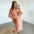 Dieses Kleid hat eine lockere Form mit weiten Ärmeln und tiefem V-Ausschnitt. Das geraffte Design verleiht dem unteren Teil Volumen. Das Material zeigt eine leicht strukturierte Oberfläche. Die Länge reicht unter die Knie. Die weiten Bündchen sorgen für einen dezenten Balloneffekt.
