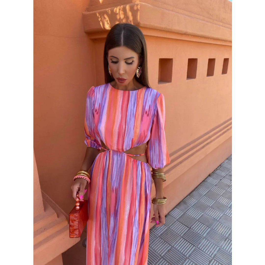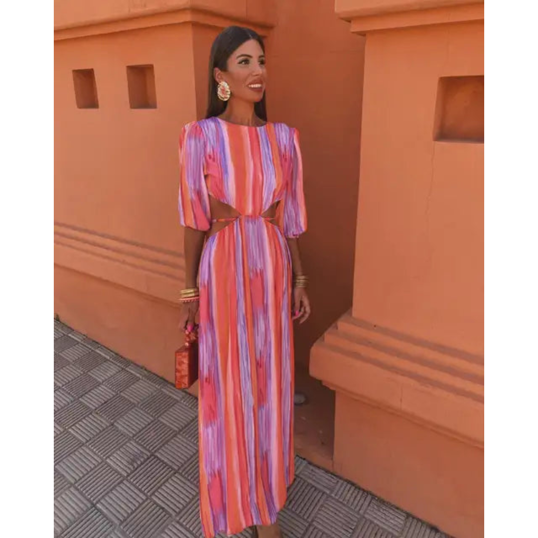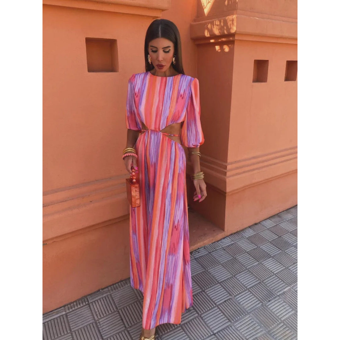 Dieses Maxikleid hat ein langes, fließendes Design mit Cut-Out-Details an der Taille und halblangen Ärmeln. Der Rundhalsausschnitt ergänzt die strukturierte Passform und verleiht dem Gesamtbild eine elegante Note. Sein Design betont eine moderne Ästhetik.