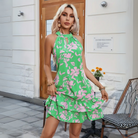 Dieses ärmellose Kleid zeigt ein Blumenmuster und einen Neckholder-Ausschnitt mit Schlitz-Detail. Das Design besitzt einen mehrlagigen Volant am Saum, der dem geraden Schnitt eine weiche Note verleiht. Die Länge endet oberhalb des Knies und der Stoff wirkt leicht und fließend.