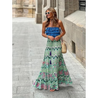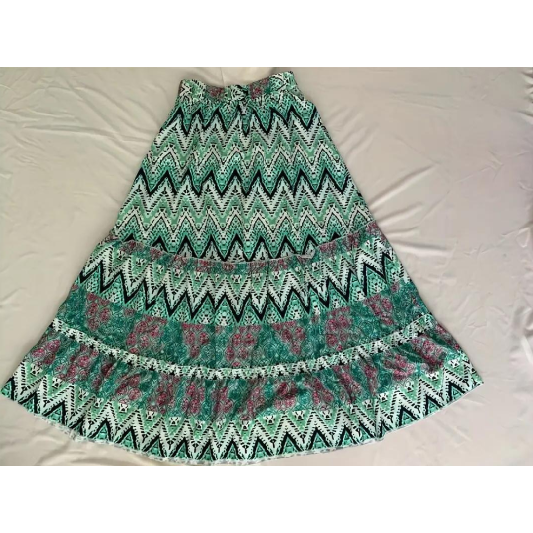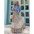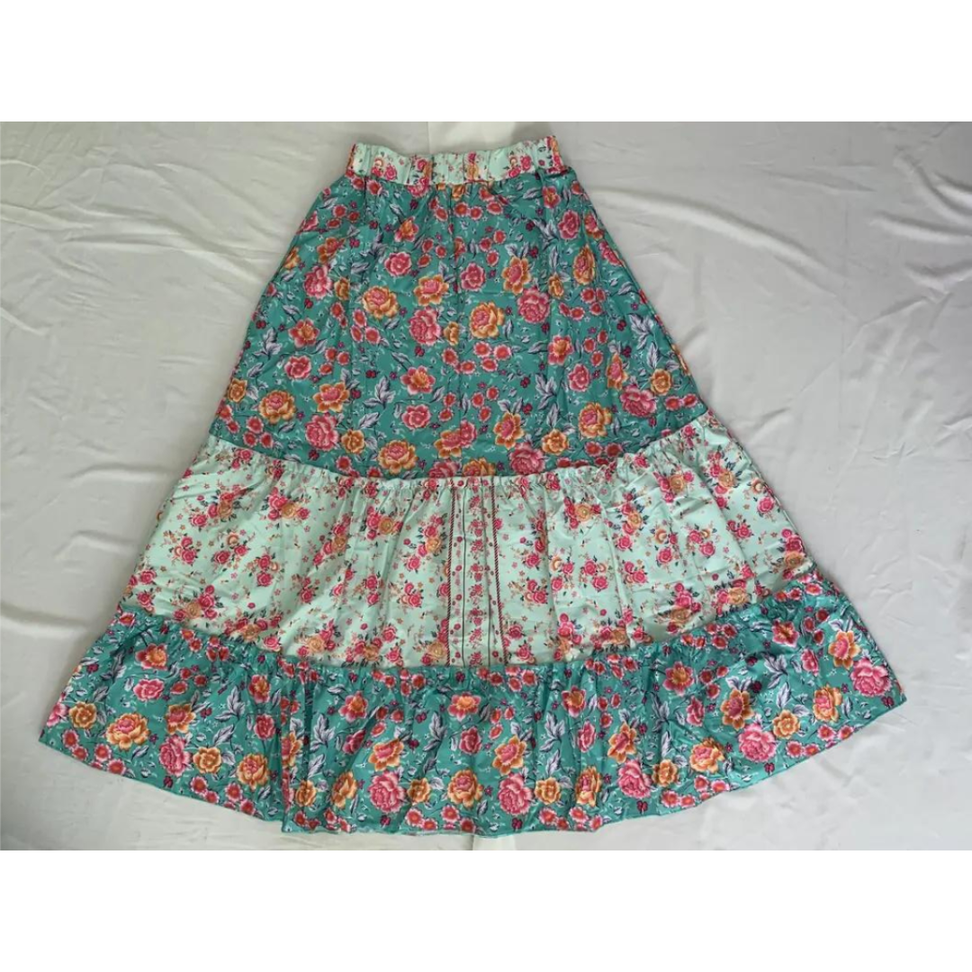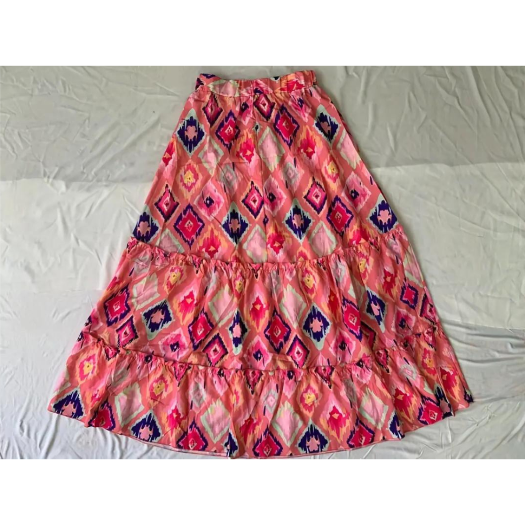 Dieser Rock zeichnet sich durch ein ausgestelltes Design mit mehrstufiger Struktur und sichtbaren gerafften Nähten aus. Die Muster variieren zwischen geometrischen, floralen und abstrakten Stilen und schaffen dynamische visuelle Effekte. Der Bund ist sichtbar und sorgt für einen sicheren Sitz. Die Länge ist voll und zeigt die fließende Form und die feinen Details.