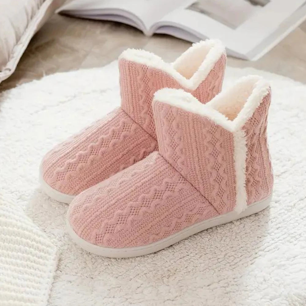 Diese Hausschuhe zeigen ein strukturiertes Strickmuster und ein hohes Schaftdesign. Das weiche Futter fügt an den Kanten ein flauschiges Detail hinzu und sorgt für ein geschichtetes und gemütliches Erscheinungsbild. Die robuste Sohle setzt einen Kontrast und rundet das Design ab.
