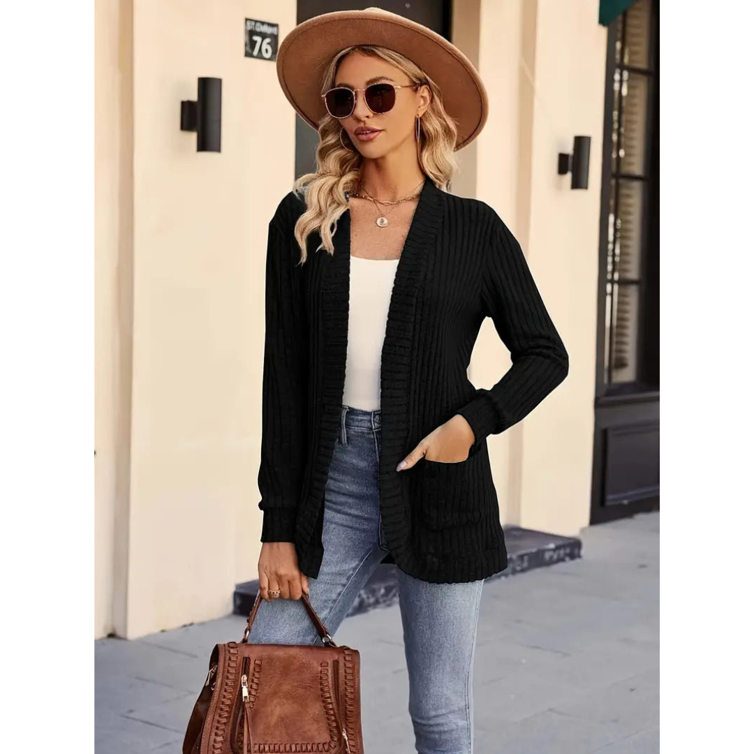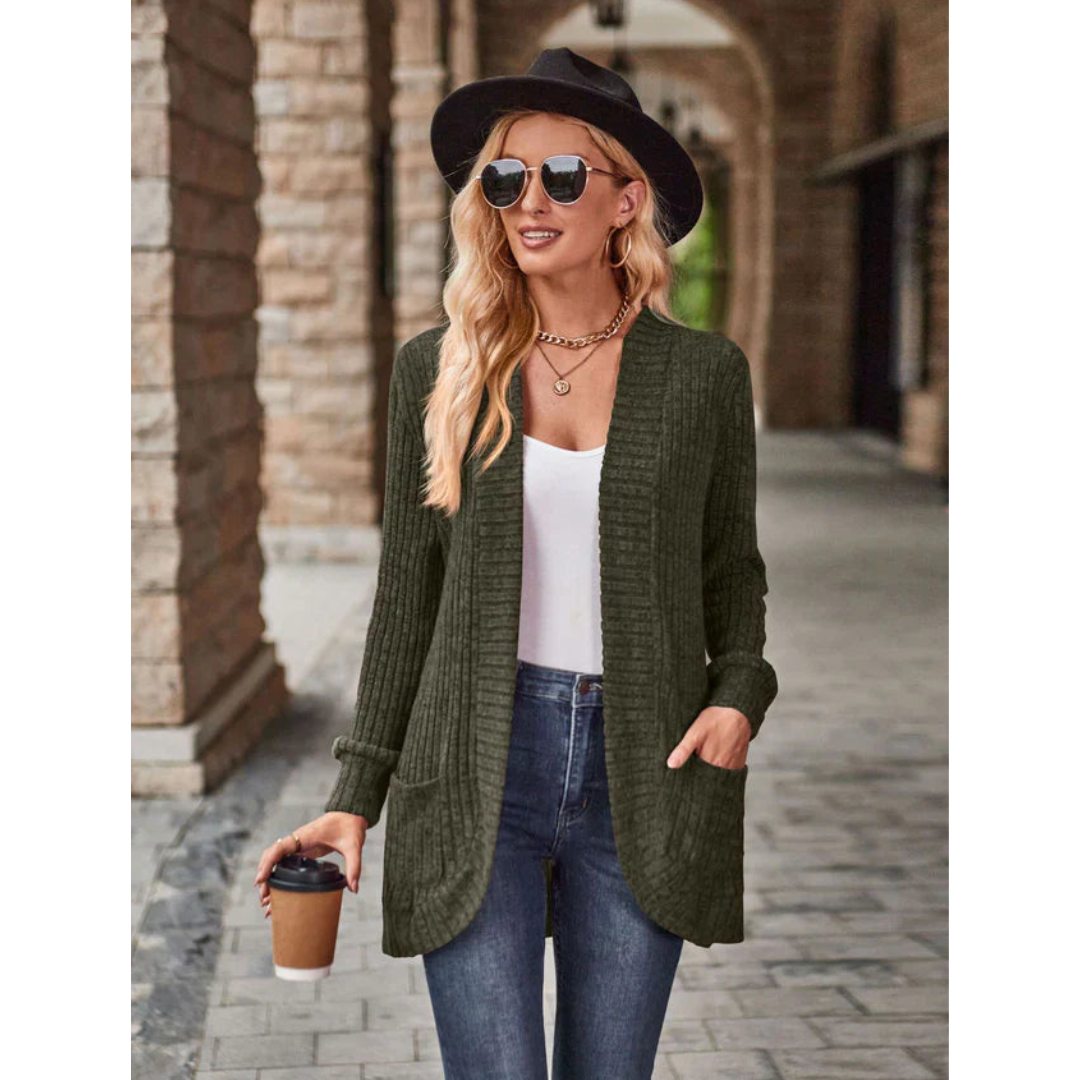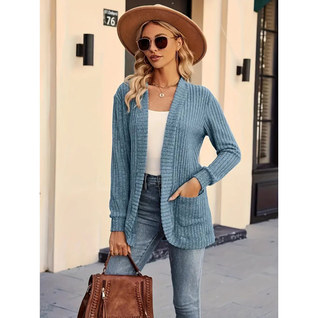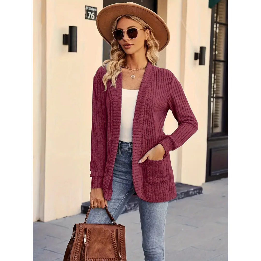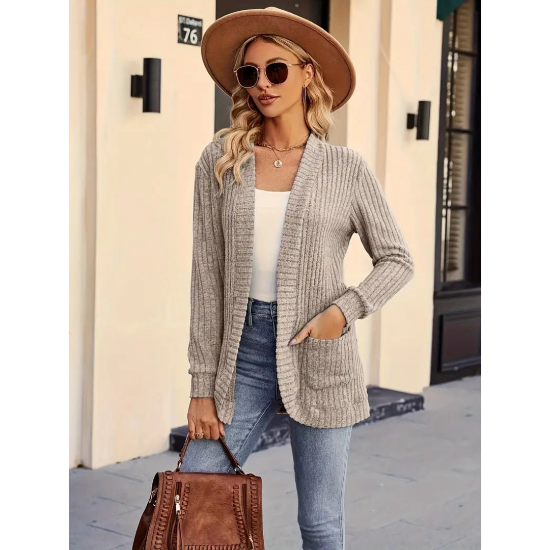 Diese Strickjacke hat ein geripptes Design mit offener Front und zwei Fronttaschen. Sie verfügt über lange Ärmel und eine standardmäßige Länge, die sich als vielseitige Lage eignet. Die Kanten und Nähte sind sauber verarbeitet und passen gut zu legeren Outfits.