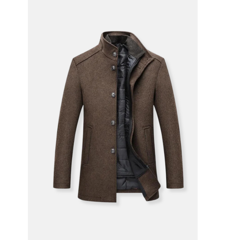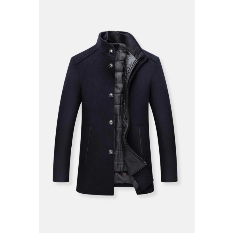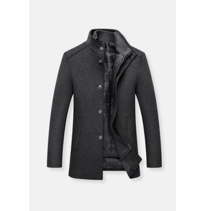 Dieser Mantel mit hohem Kragen für Herren verfügt über eine Knopfleiste vorne und eine Reißverschluss-Innenschicht als Detail. Der Mantel hat lange Ärmel und zwei dezente Seitentaschen. Sein strukturiertes Design sorgt für ein elegantes Erscheinungsbild. Sichtbare Nähte verleihen dem Design einen Hauch von Handwerkskunst.