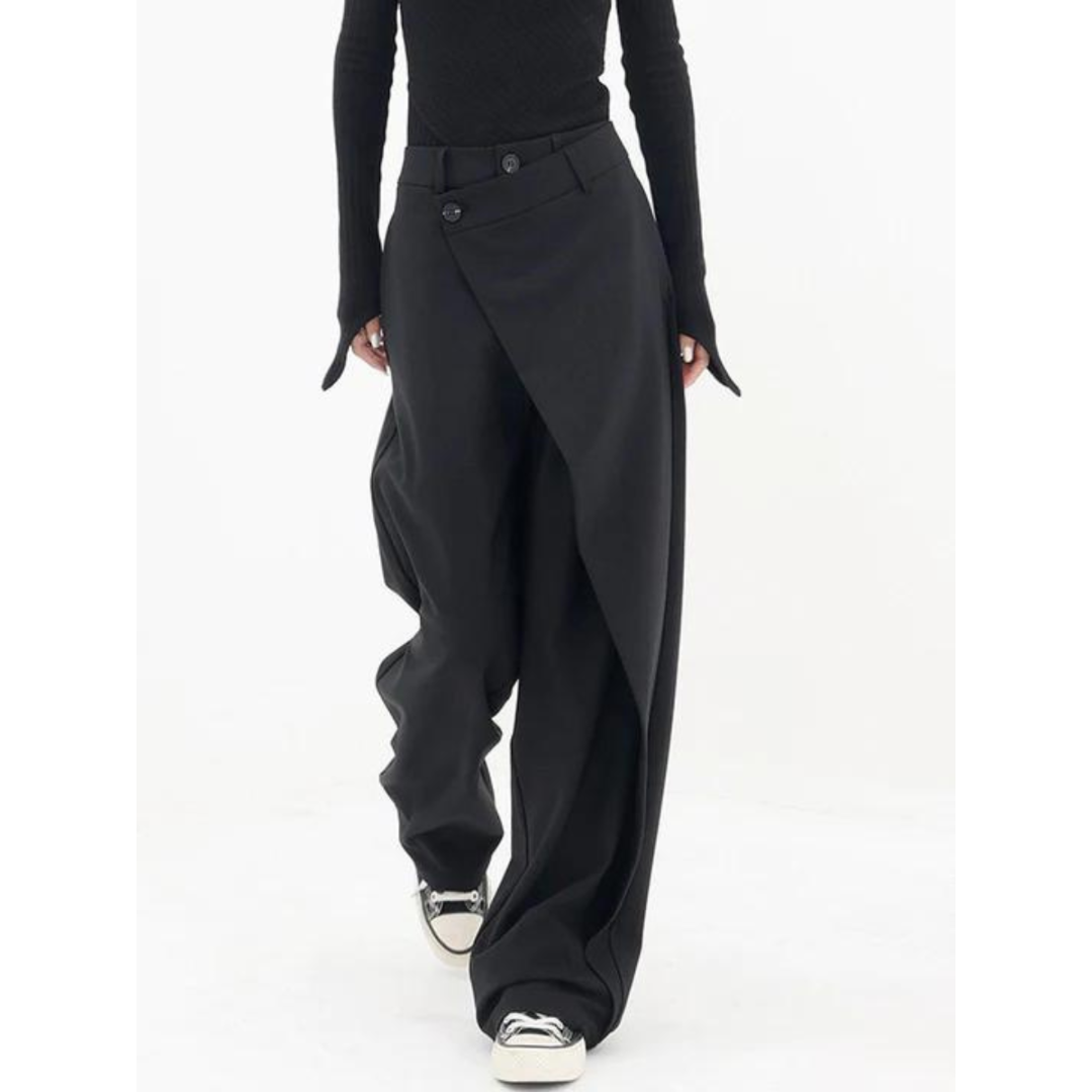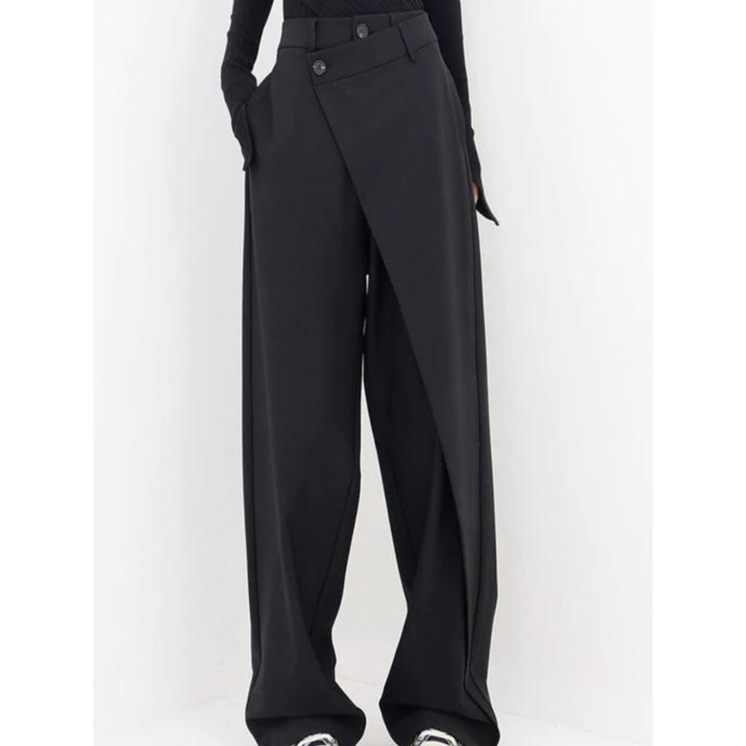 Diese Hose ist hoch geschnitten und hat weite Beine mit klaren Falten und einem Gürtel für eine strukturierte Passform. Die Vorderseite der Hose zeigt ein markantes Knopfdetail und eine diagonale Falte, die ein interessantes Designelement hinzufügt. Die Hose fällt natürlich und bietet einen dynamischen Look.