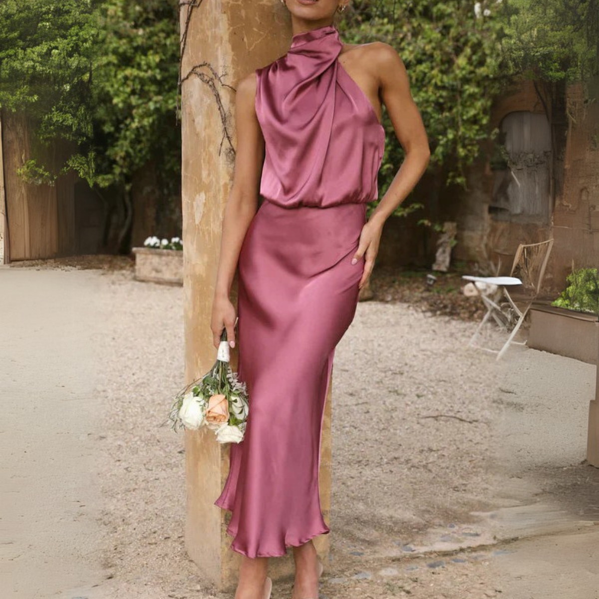 Dieses Damen-Midikleid zeichnet sich durch ein drapiertes Neckholder-Design mit gerafftem Ausschnitt aus. Die taillierte Passform geht in einen fließenden Rock über, der unter das Knie fällt. Der ärmellose Schnitt und das glatte Material schaffen eine elegante Silhouette. Der Rücken verfügt über einen sicheren Verschluss für eine strukturierte Passform.
