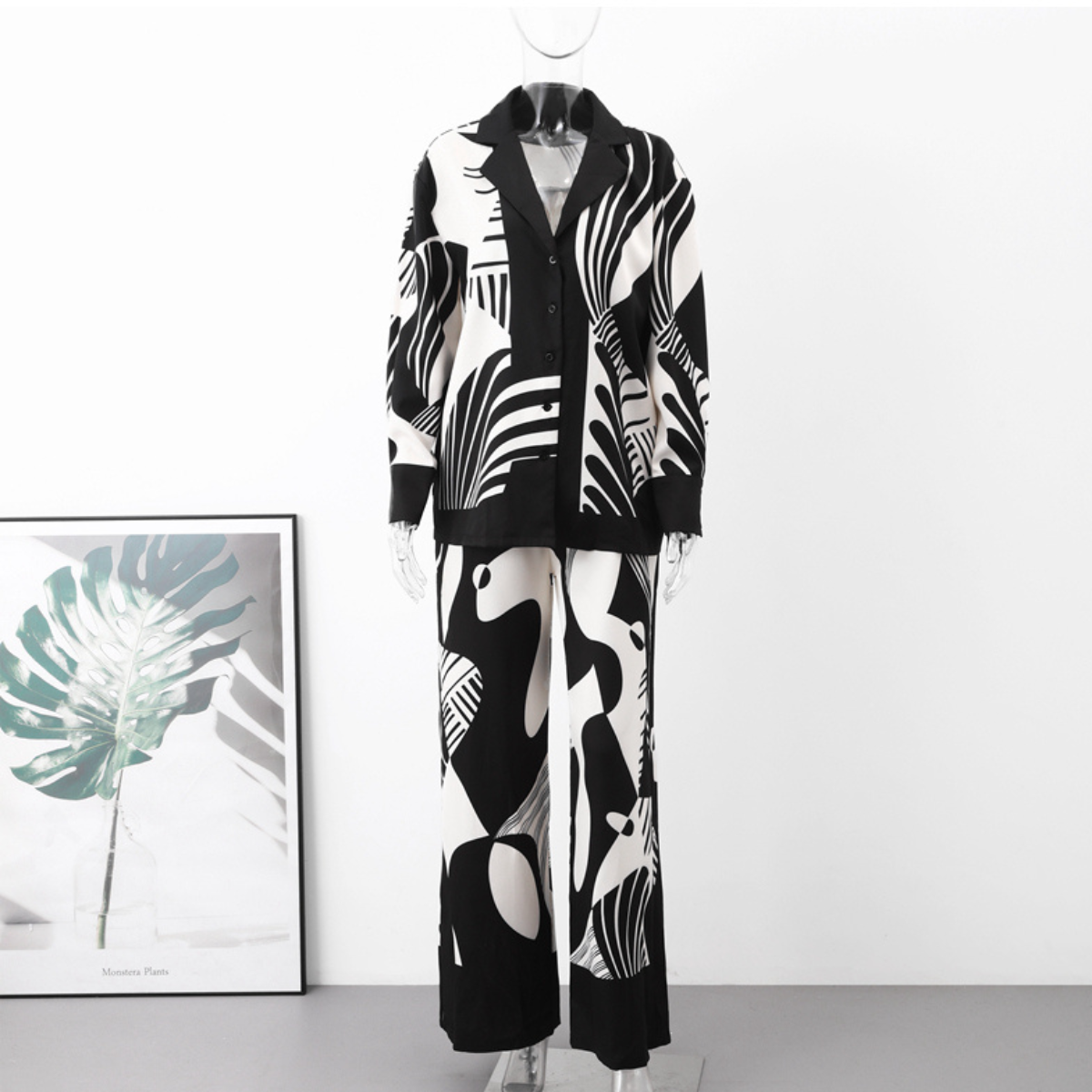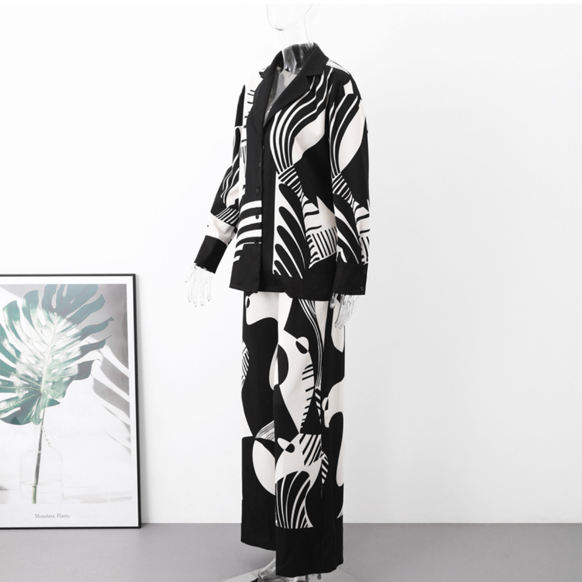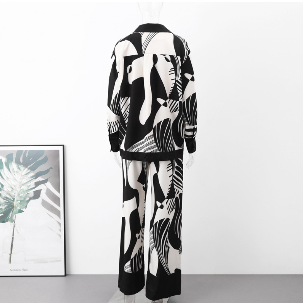 Dieses zweiteilige Set besteht aus einem langärmeligen Oberteil mit Knopfleiste und weit geschnittenen Hosen. Das abstrakte Muster setzt markante Akzente. Das Oberteil hat eine lockere Silhouette, während die Hose fließend fällt. Ein modernes Ensemble mit einzigartigem Design.