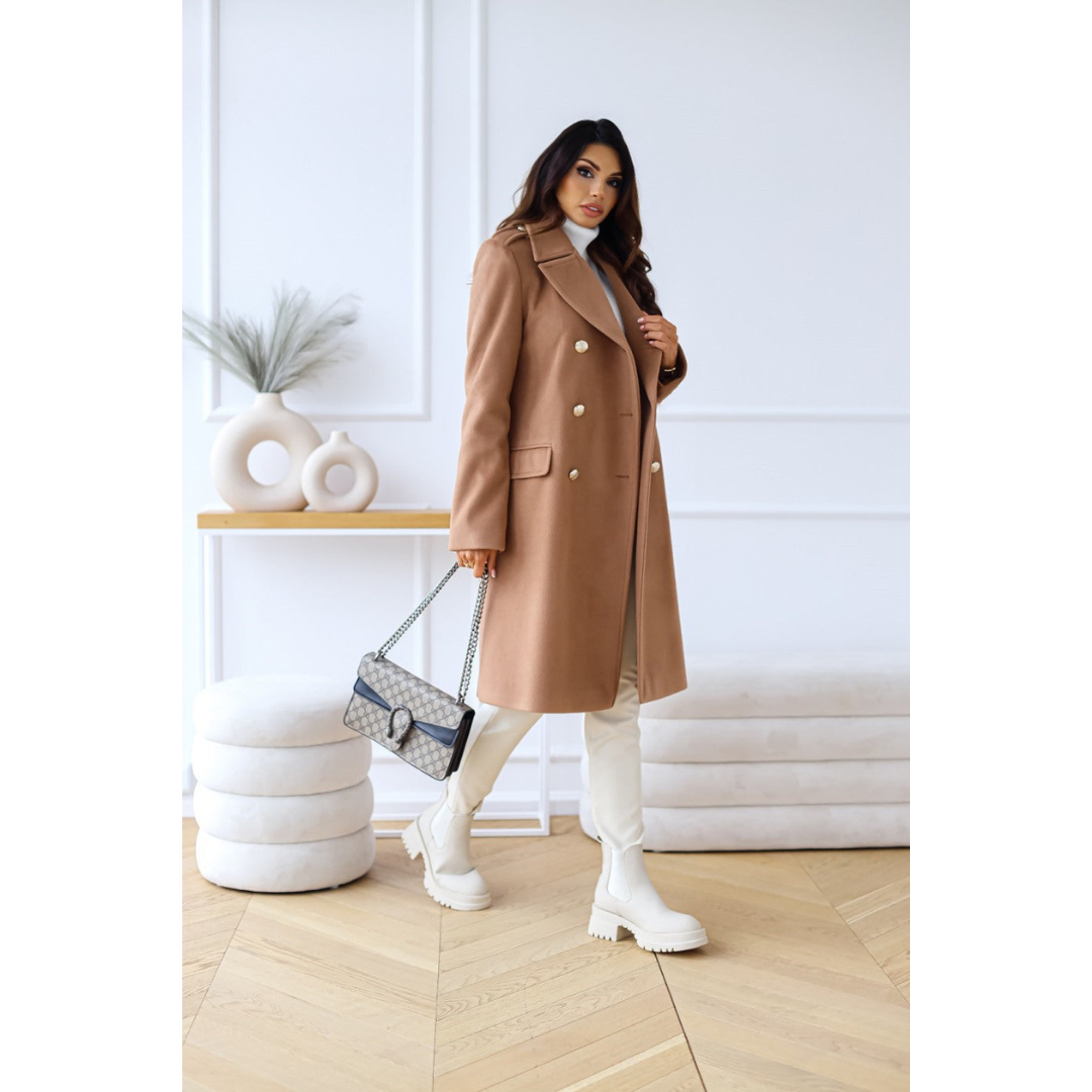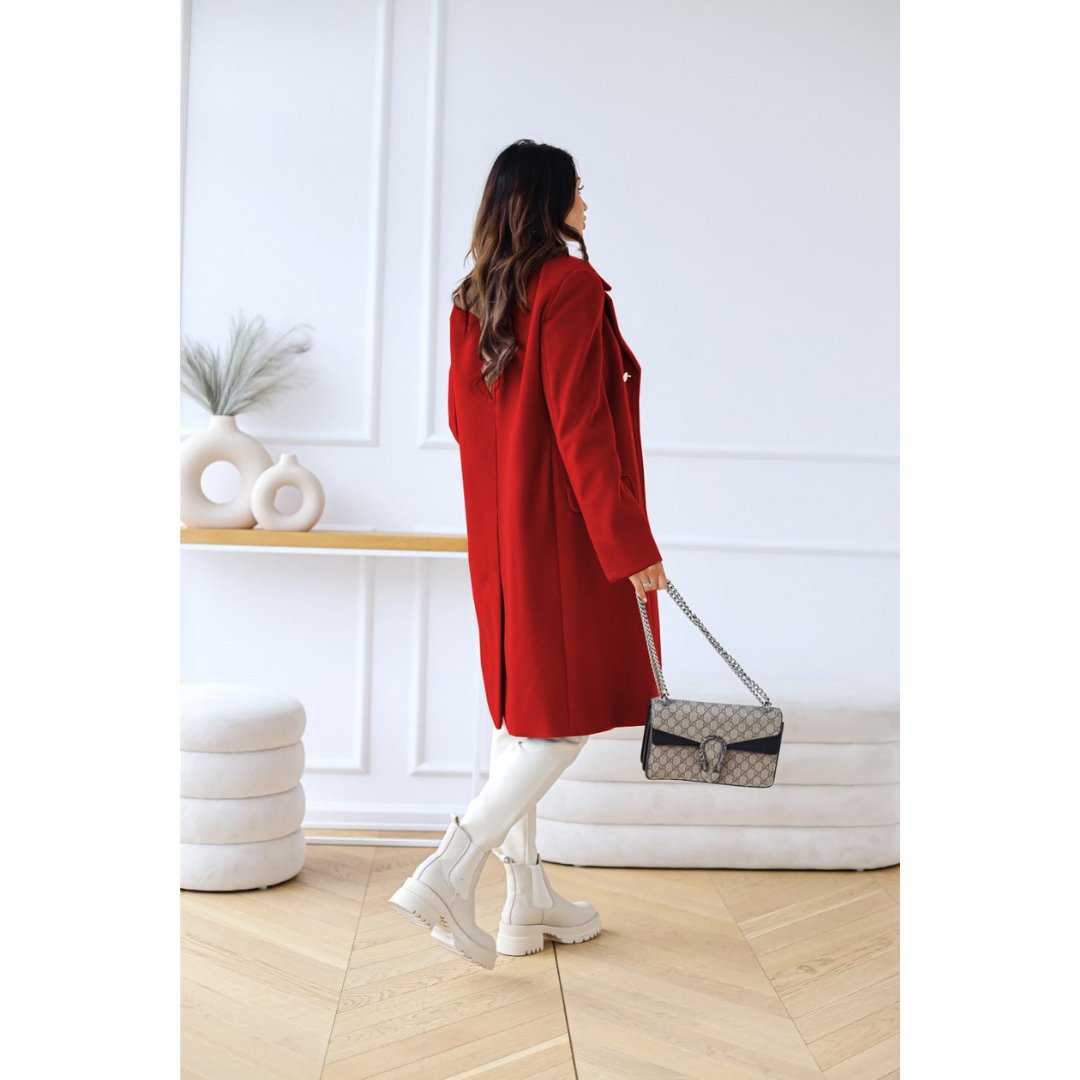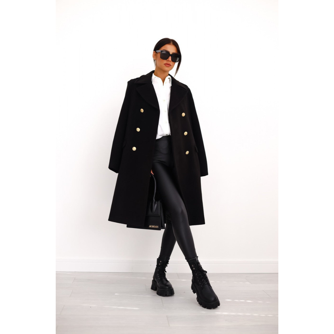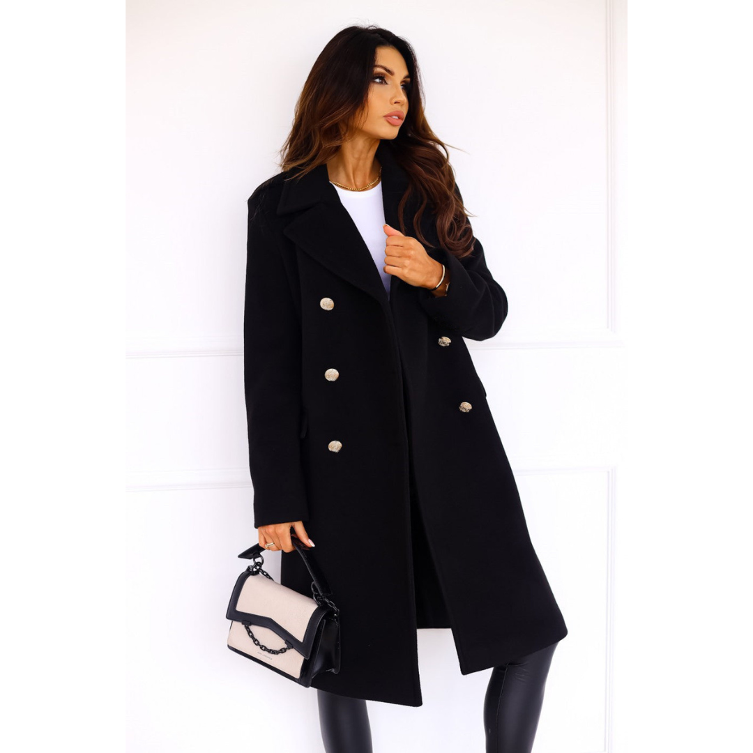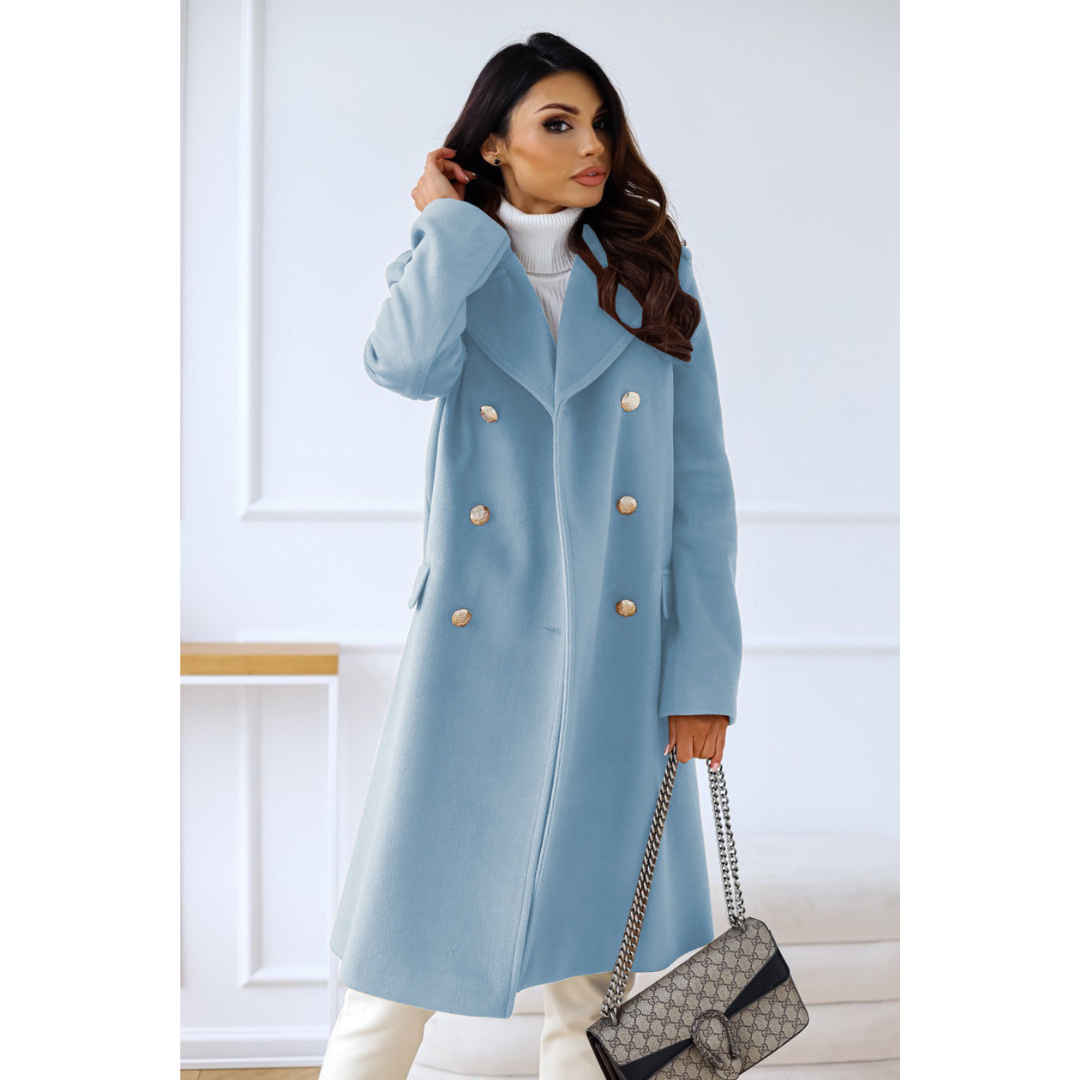 Dieser zweireihige Mantel zeichnet sich durch ein strukturiertes Design mit großen, symmetrisch angeordneten Knöpfen auf der Vorderseite aus. Der spitze Reverskragen verleiht einen markanten Akzent. Der Mantel ist lang geschnitten und verfügt über Seitentaschen, was ihm ein elegantes und schlichtes Erscheinungsbild verleiht.